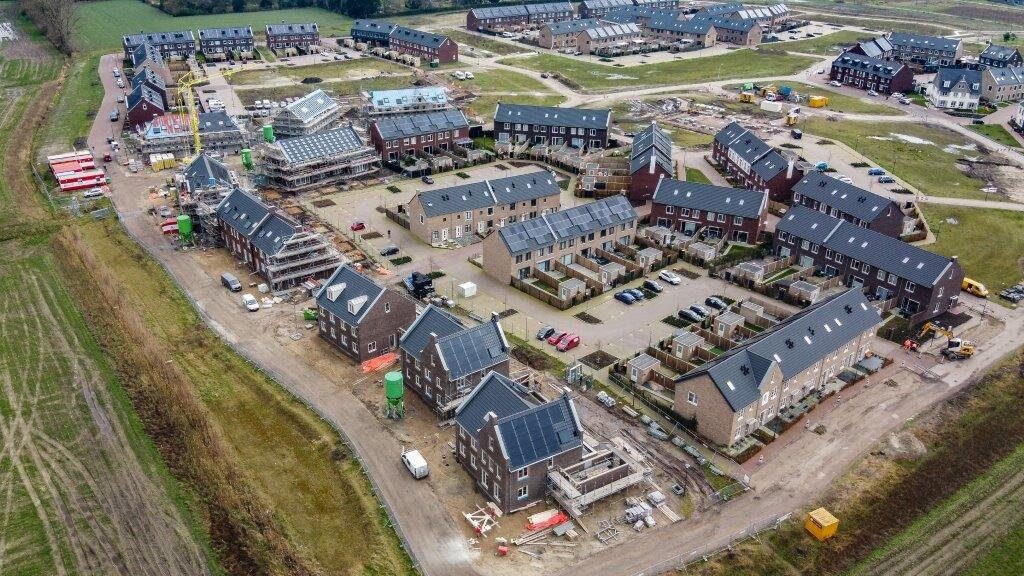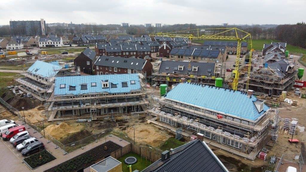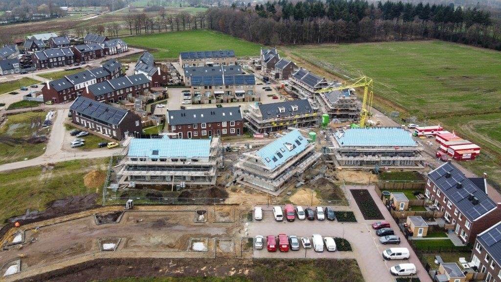 Een mooie foto van het bouwproject 31 woningen in Deventer (Van Wijnen) waar onze elektromonteurs en installatiemonteurs druk aan de gang zijn om alle woningen van de E en W installaties te voorzien. Spot jij de busjes in het Van Losser rood?